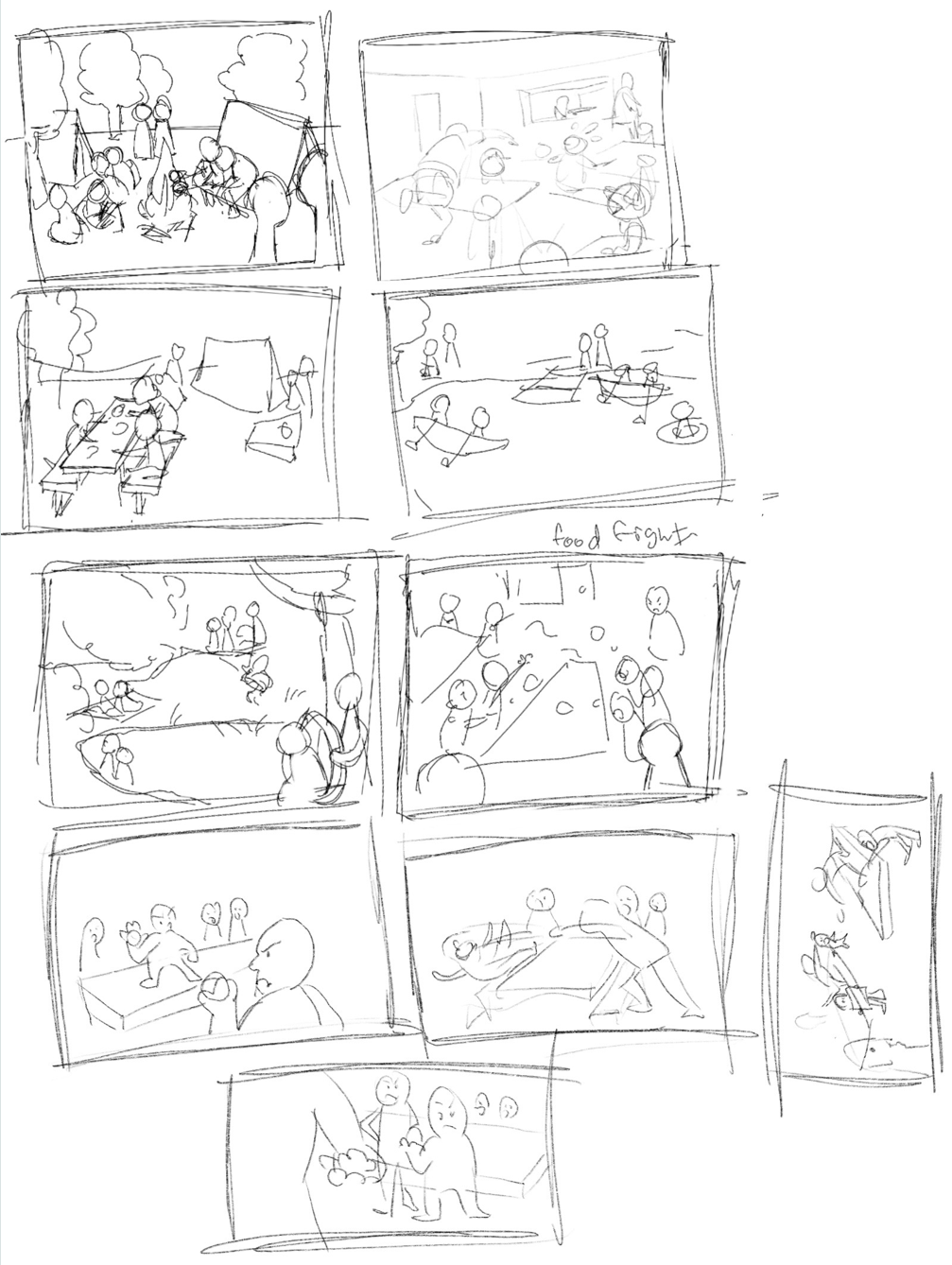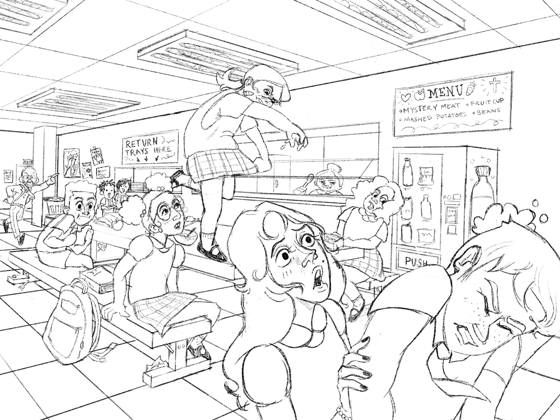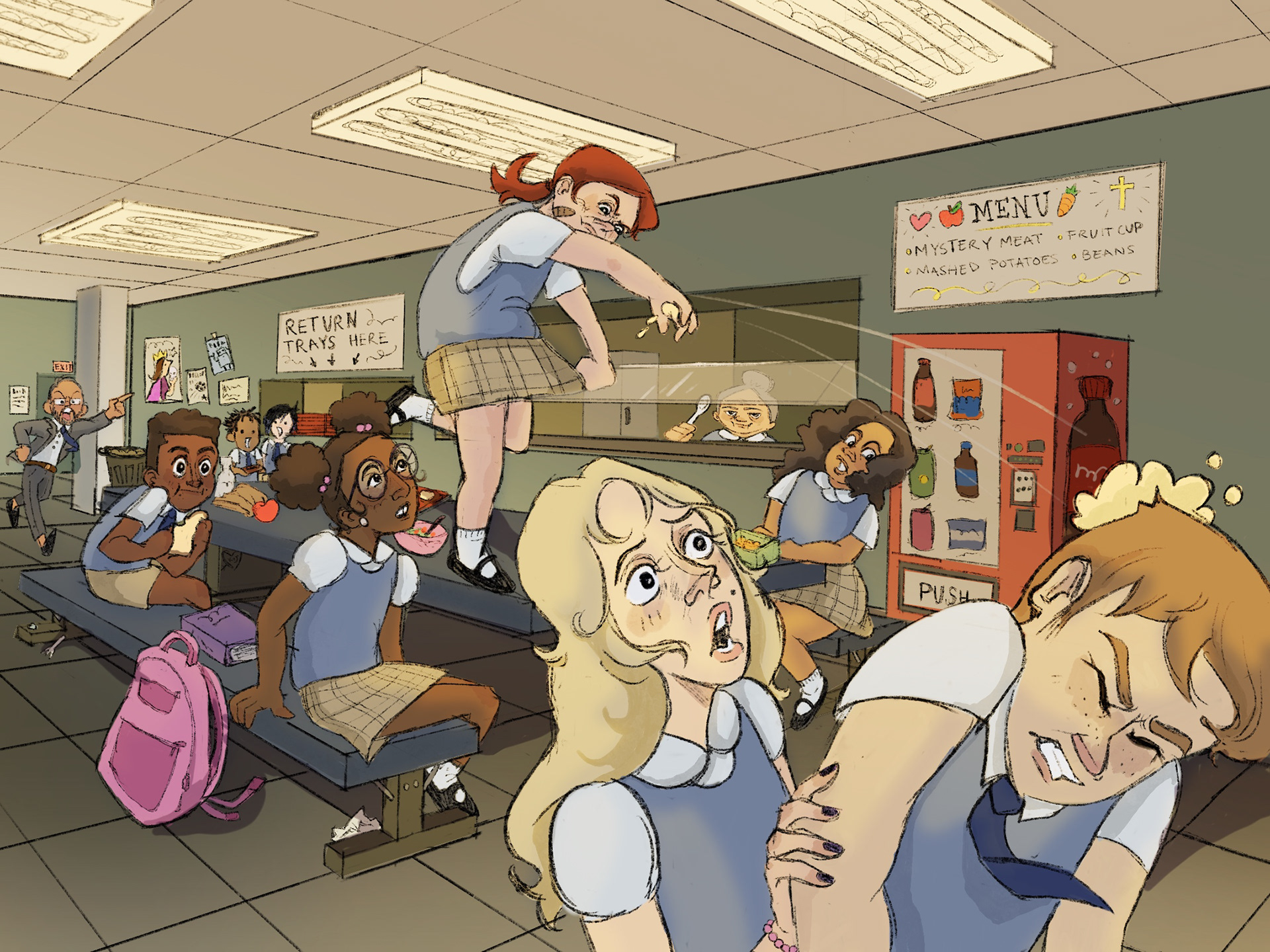 Illustration using perspective with 10 figures within the scene. After putting up with enough teasing, a young girl gets up on the lunch table and chucks a handful of mashed potatoes at the back of her bully's head!